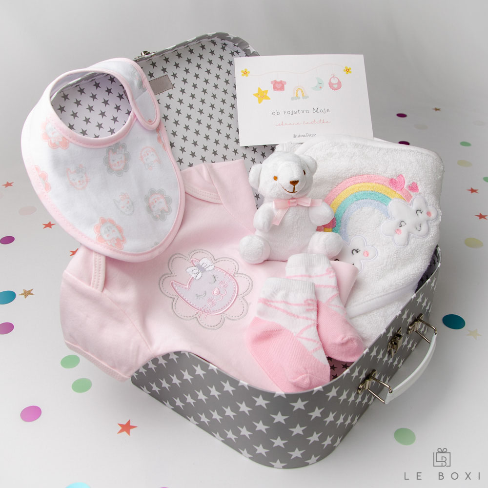 - Kovčeg sive boje s bijelim zvjezdicama, koji služi kao kutija u kojoj se slažu proizvodi. Roditelji ga kasnije mogu iskoristiti kao kutiju za spremanje dječjih uspomena. Dimenzije: (D x Š x V) 29cm x 9,5 cm x20 cm.
