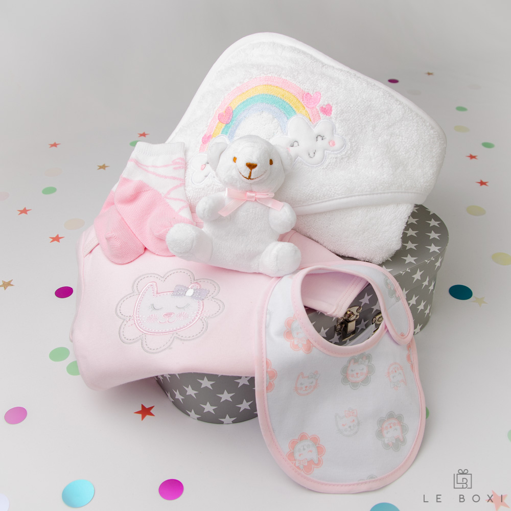 - Ružičasti pamučni komplet za novorođenče s izvezenim motivom mačke i plišani medvjedić-prekrasan komplet sadrži bodi, podbradnjak i čarapice od mekanog pamuka te medvjedića. Prikladno za dob od 0 do 3 mjeseca. Sastav: odjeća: 100 % pamuk i igračka: 100 % poliester