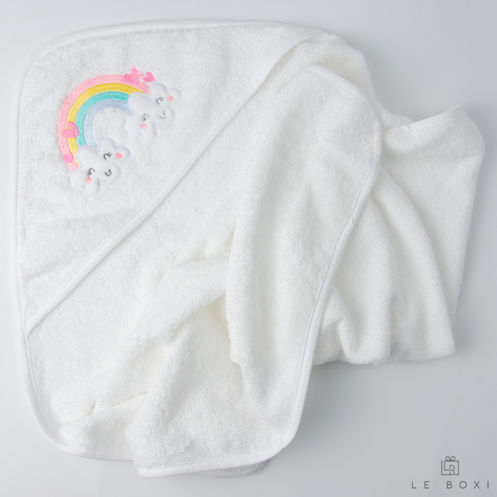 - Kvalitetan mekani dječji pamučni ručnik s kapuljačom i motivom duge napravljen kako bi djeci bilo ugodno. Najmlađe će oduševiti izvezeni motiv duge. Dimenzije: 70 x 70 cm. Sastav: 90 % pamuk, 10 % poliester