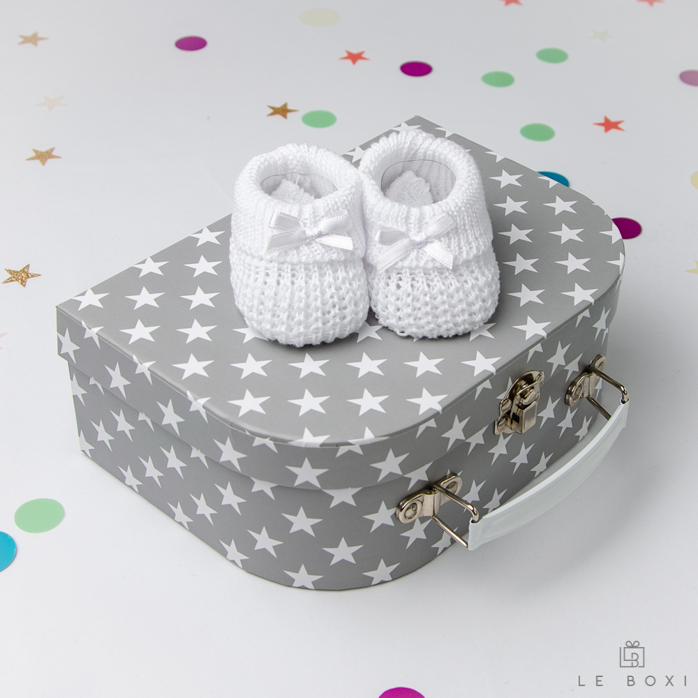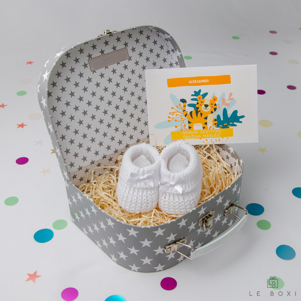 - Kovčegsive boje s bijelim zvjezdicama, koji služi kao kutija u kojoj se slažu proizvodi. Roditelji ga kasnije mogu iskoristiti kao kutiju za spremanje dječjih uspomena. Dimenzije: (D x Š x V) 20cm x 8 cm x14,5 cm.
