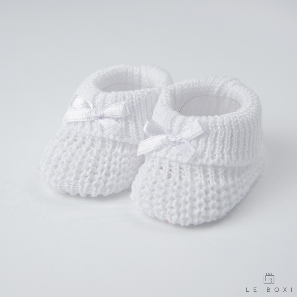 - Bijele pamučne pletene papučice – par bijelih pletenih papučica od 100 % pamuka za novorođenče, koje će pomoći da nožice vašeg djeteta ostanu tople. Sastav: 100 % pamuk