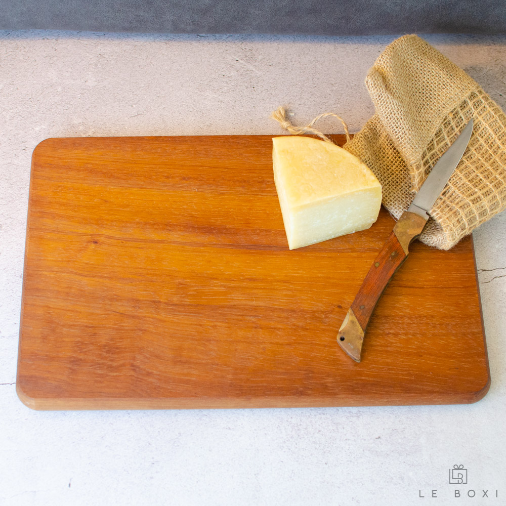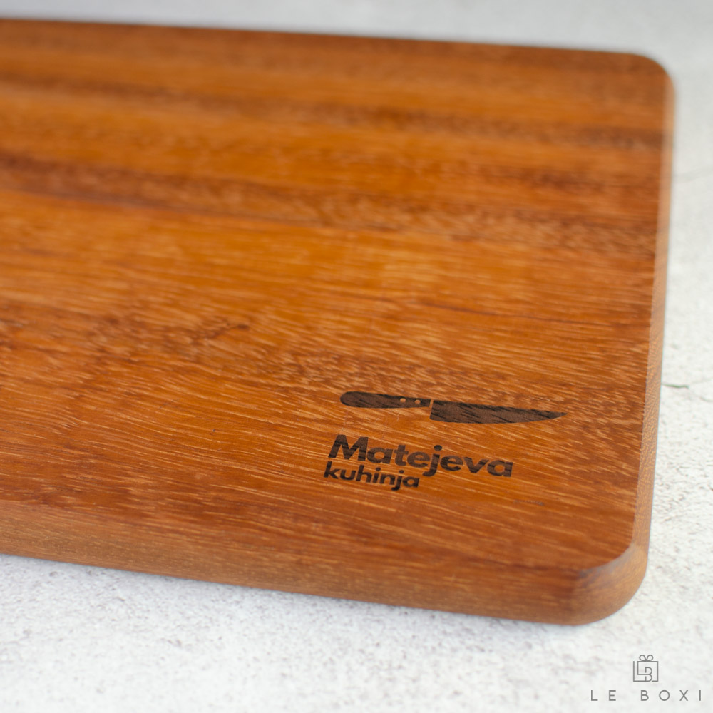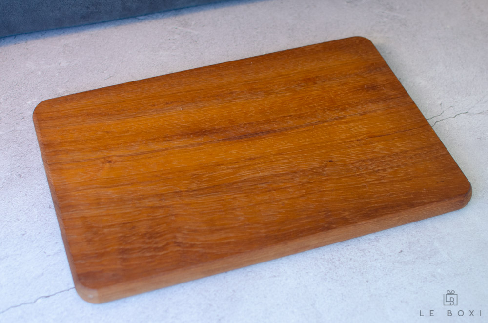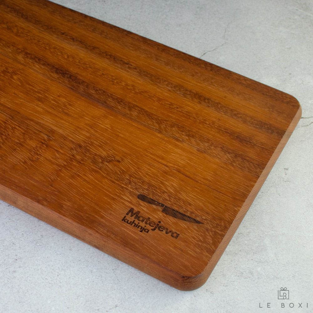 Lesena deska za rezanje (iroko) je zaščitena z naravnim oljem. Če deska čez čas postane bolj suha, nanjo samo poškropite nekaj kapljic olivnega olja. Olje razmažite po deski in pustite da jo les vpije.